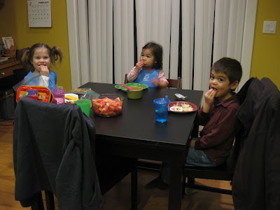 Emi led her first story time today after dinner. She grabbed her favorite book (Shiny Dinah- from Kindermusik)and sat in her hippo chair. I set up her stuffed animals to listen to her read on the blanket...I was going to get a video next but story time didn't last long enough, it was very cute though!